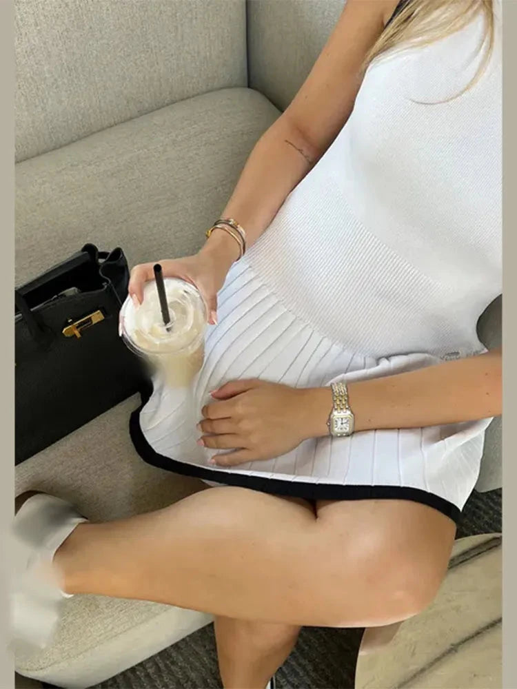 This sleeveless pleated mini dress pairs a streamlined, fitted bodice with a playful pleated skirt and contrasting trim for an instantly polished look. Designed for versatile wear from casual brunches to evening cocktails, the high neck and clean lines create a refined silhouette that moves with you.