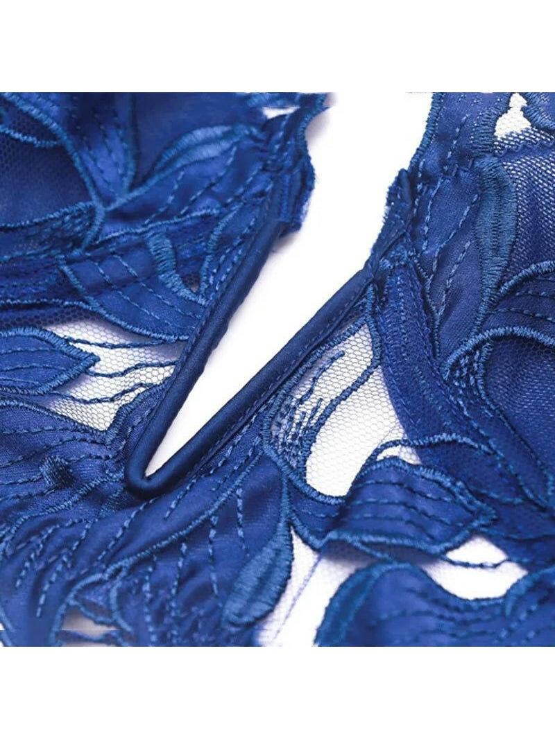 • Material: Premium spandex and nylon blend with embroidered lace overlay • Includes: Matching bra and panties set